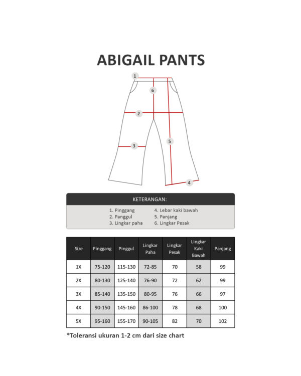 Size (Lingkar pinggang x Lingkar panggul x Lingkar paha x Lingkar pesak x Lingkar kaki bawah x Panjang)