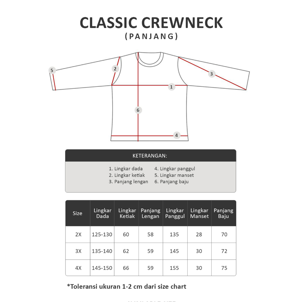 Size (Lingkar dada x Lingkar ketiak x Panjang lengan x Lingkar panggul x Lingkar Manset x Panjang baju)