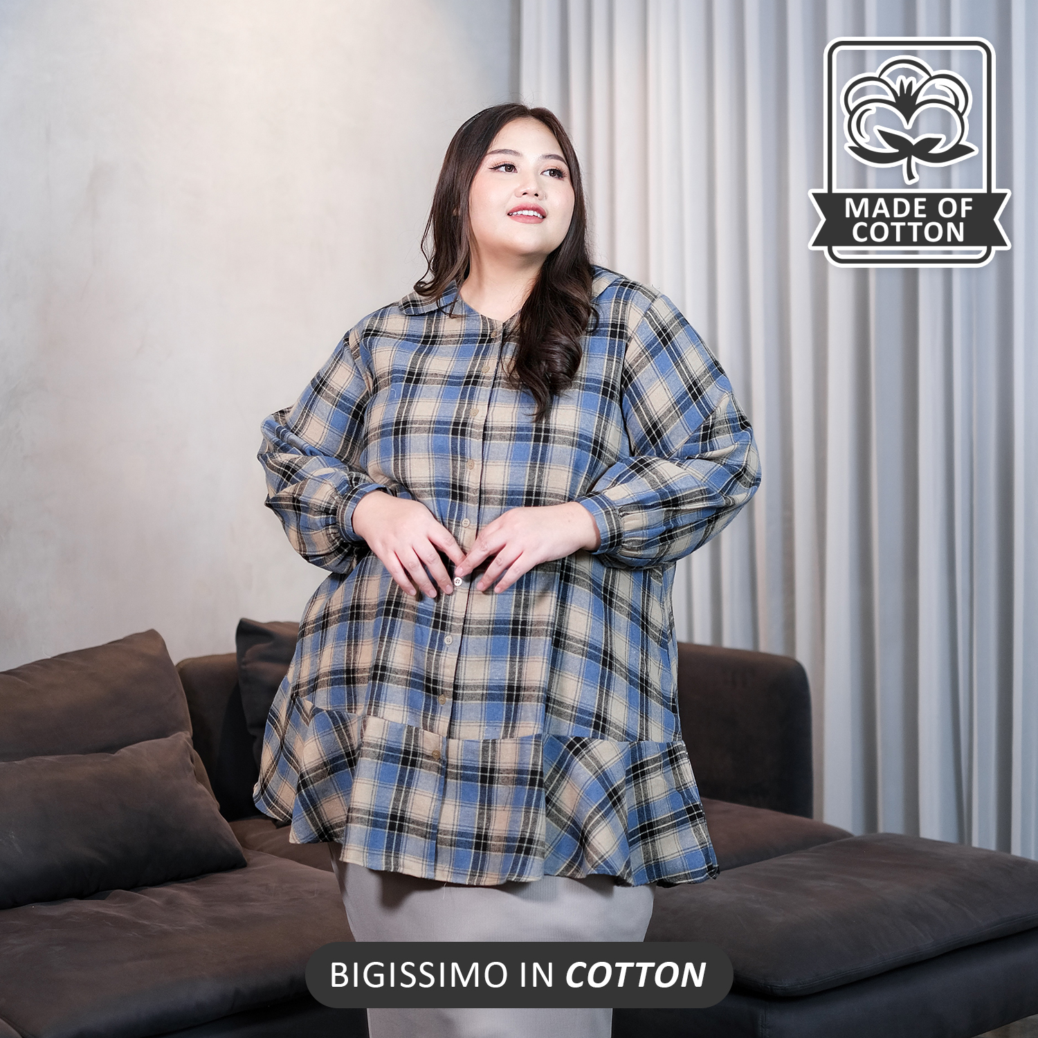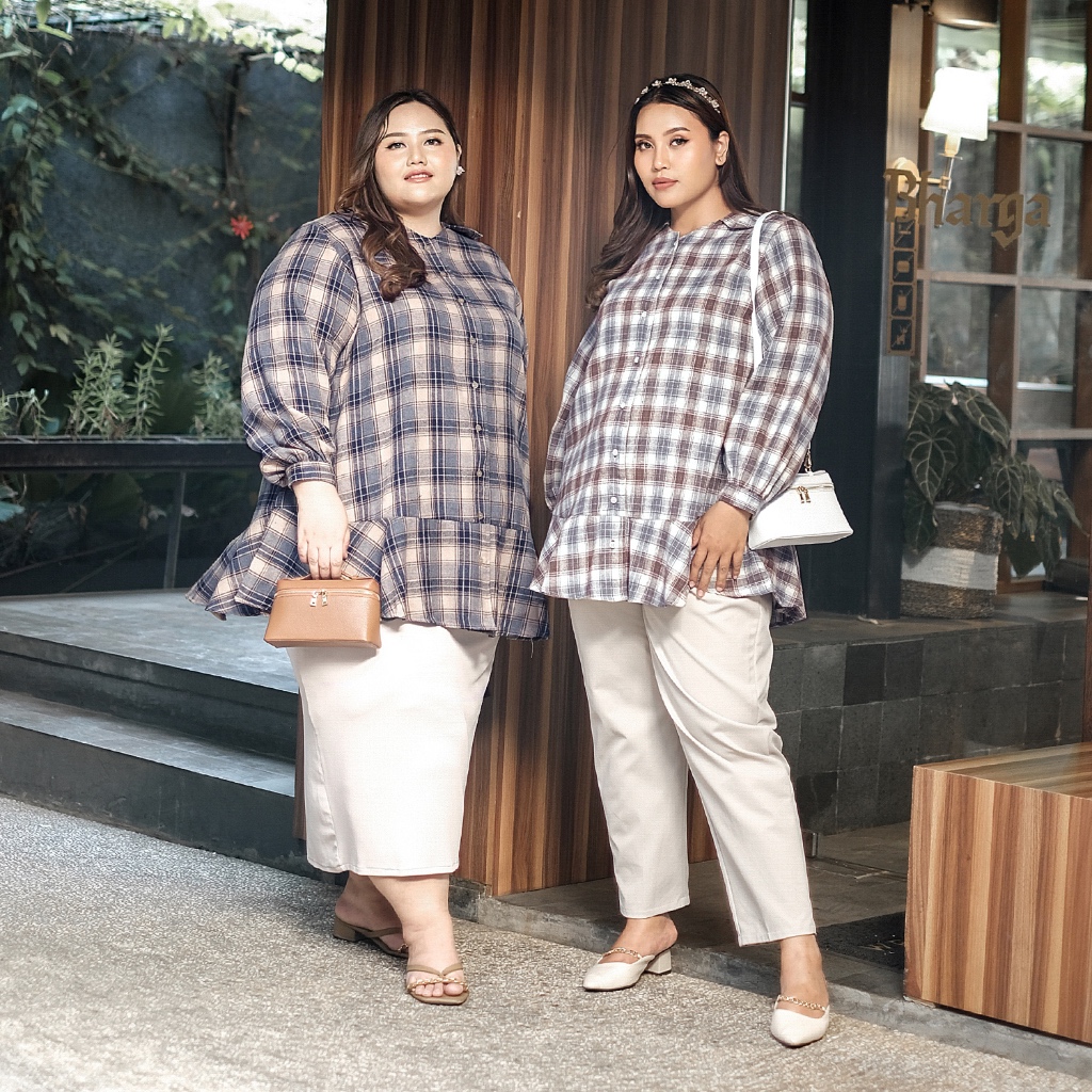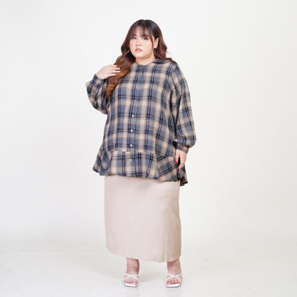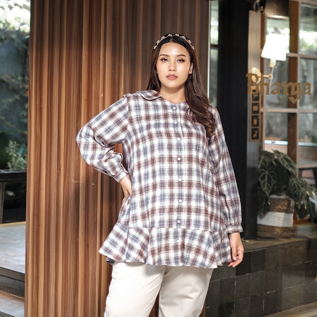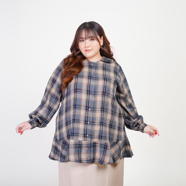 Blouse flanel bergaya Korean Style yang super chic, dengan material nyaman dan cutting A-line, menciptakan ilusi slim look saat dikenakan.
