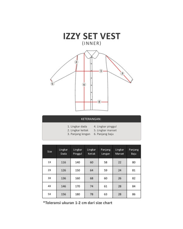 Size (Lingkar dada x Lingkar pinggul x Lingkar ketiak x Panjang lengan x Lingkar manset x Panjang baju)