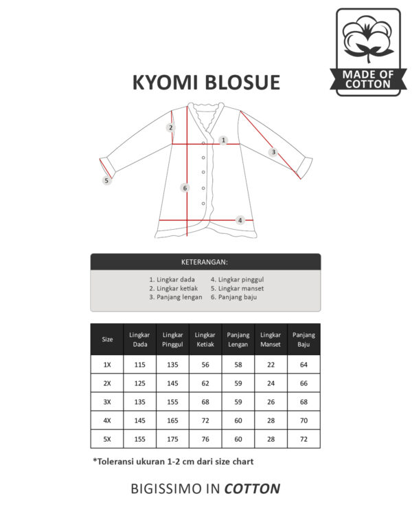 Size (Lingkar dada x Lingkar pinggul x Lingkar ketiak x Panjang lengan x Lingkar manset x Panjang baju)