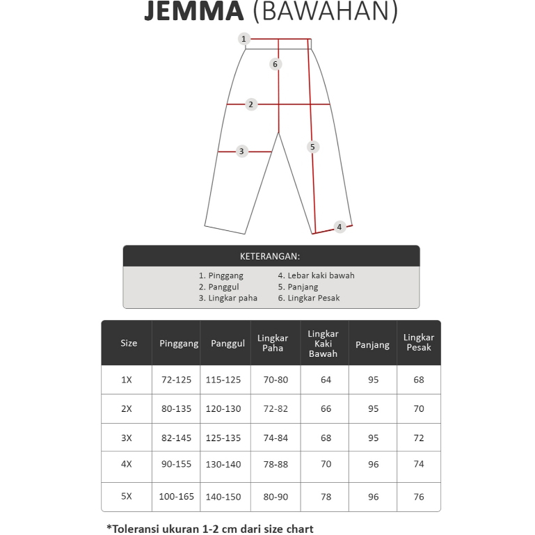 Size (Lingkar pinggang x Lingkar panggul x Lingkar paha x Panjang x Lingkar kaki bawah x Lingkar pesak)