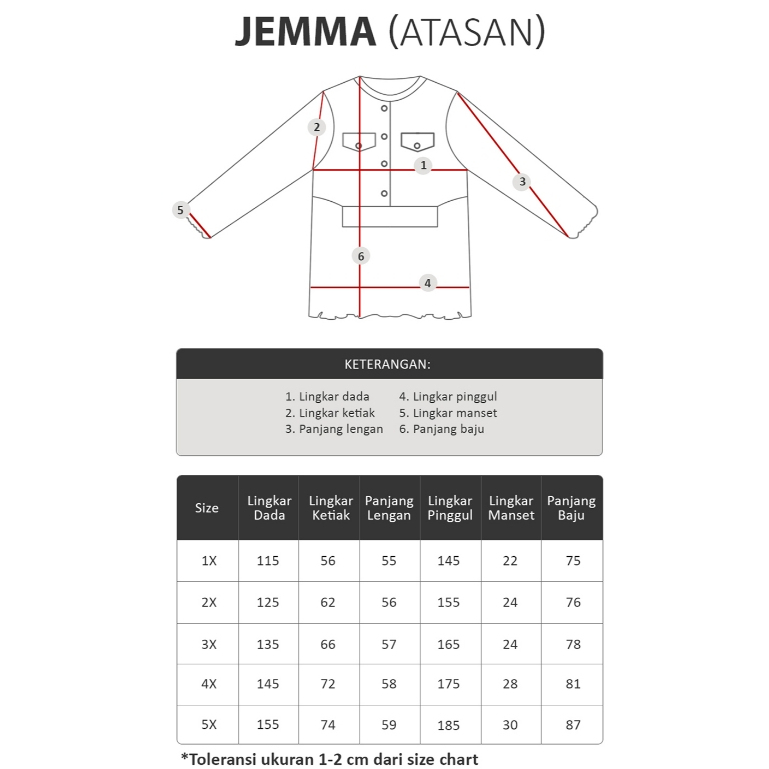 Size (Lingkar dada x Lingkar ketiak x Panjang lengan x Lingkar panggul x Lingkar manset x Panjang baju)