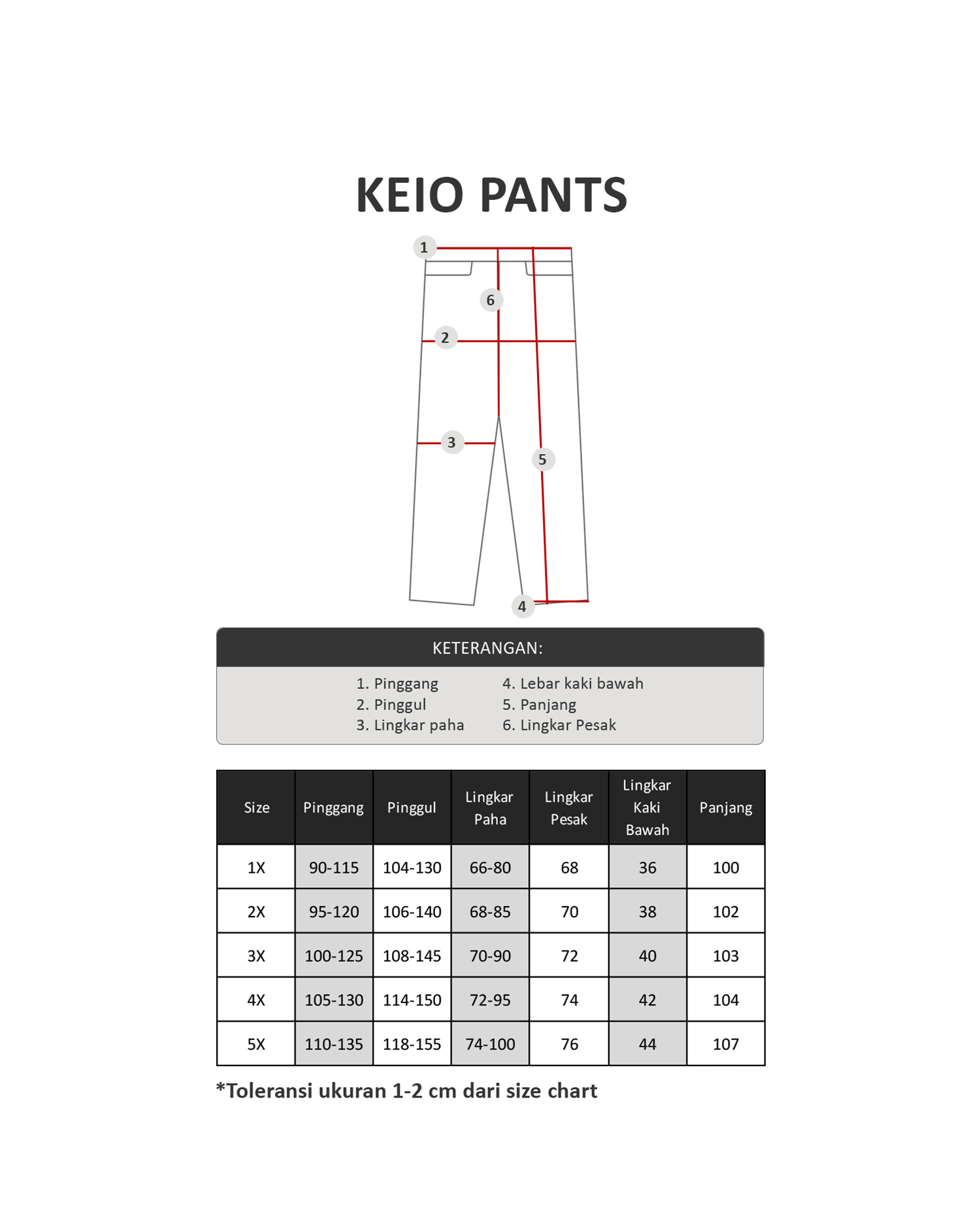 Size (Lingkar pinggang x Lingkar panggul x Lingkar paha x Panjang x Lingkar kaki bawah x Lingkar pesak)