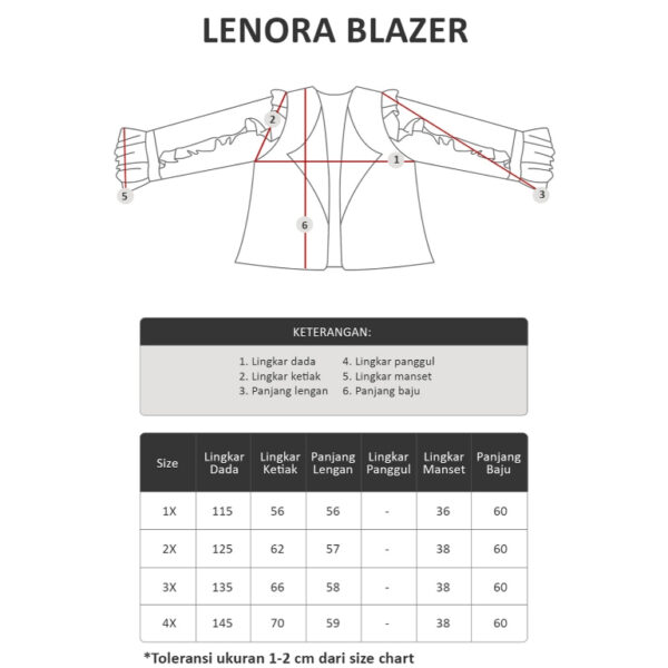 Size (Lingkar dada x Lingkar ketiak x Panjang lengan x Lingkar manset x Panjang baju)