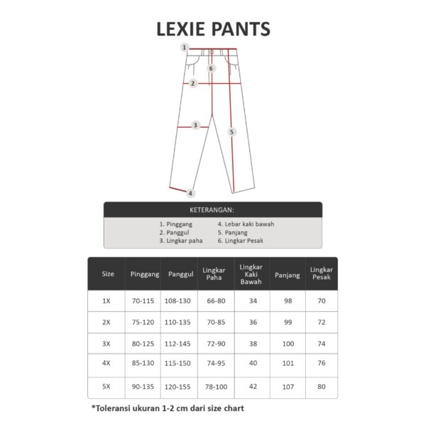 Size (Lingkar pinggang x Lingkar panggul x Lingkar paha x Panjang x Lingkar kaki bawah x Lingkar pesak)
