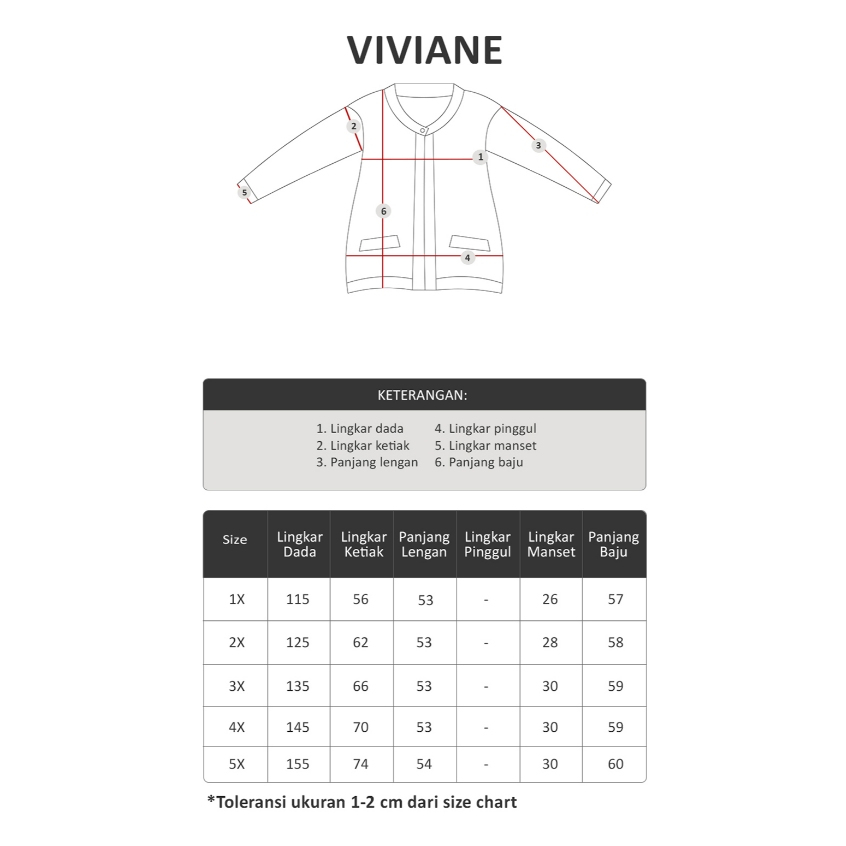 Size (Lingkar dada x Lingkar ketiak x Panjang lengan x Lingkar manset x Panjang baju) SIZE 1X: 115cm x 56cm x 53cm x 26cm x 57cm